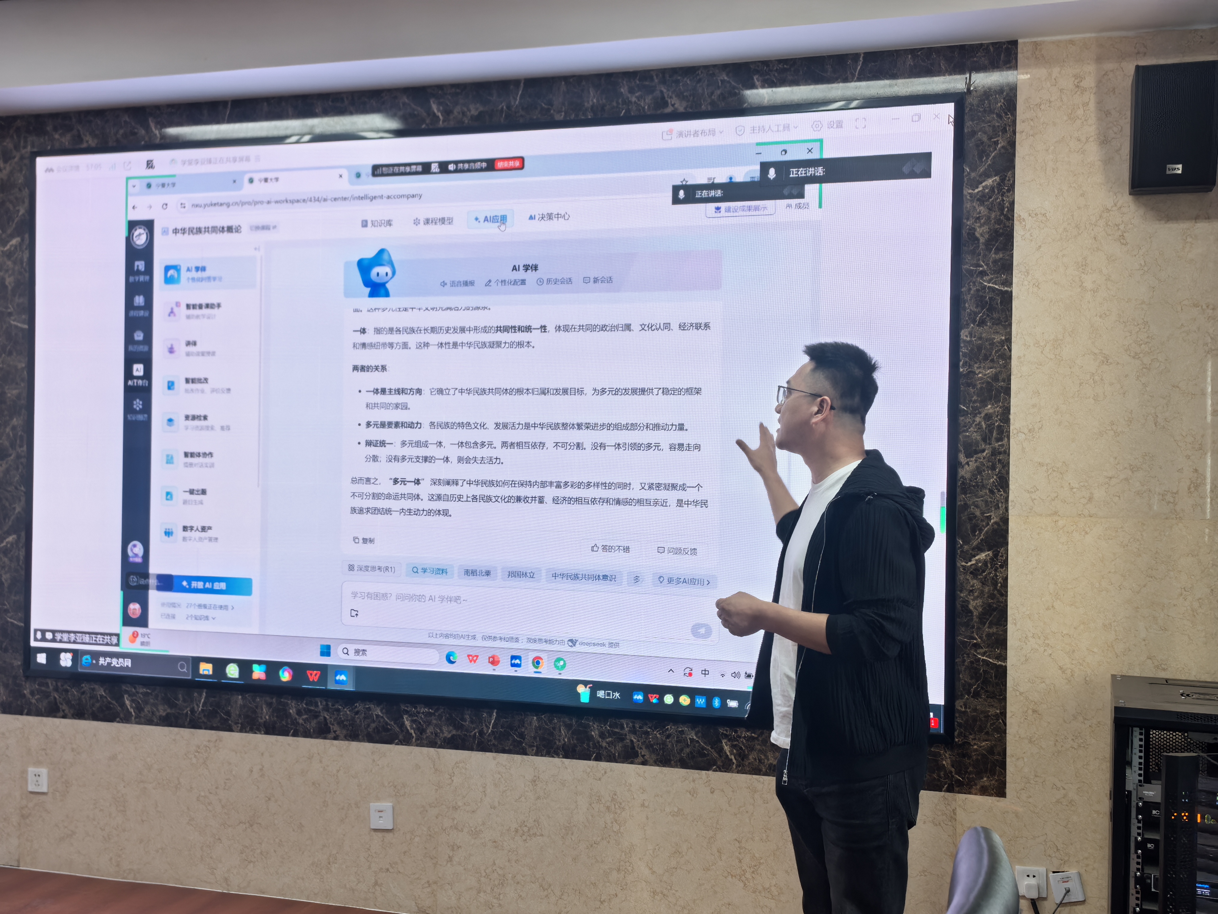 随后,培训环节正式开展。作为全国高校教师教学创新大赛二等奖、国家民委《中华民族共同体概论》教学展示活动一等奖获得者,邓文韬教授首先分享了教学经验,重点介绍了我校已建设完成并上线运行的《中华民族共同体概论》AI智慧课平台的基本情况、核心功能,结合自身参赛经历,讲解了如何运用AI技术优化教学展示、提升教学效果,为教师们提供了可借鉴、可落地的实践范例。